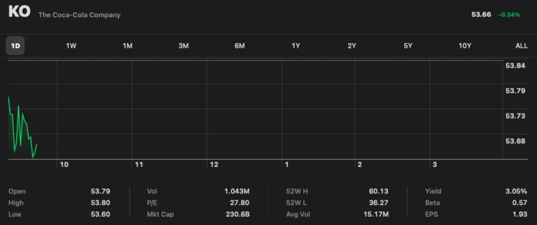 코카콜라 주식은 주당 $53.66이고, 배당률은 3.05%로 은행에 대비해서 상당히 짭짤한 배당금을 받을 수 있습니다 ^^ (분기기준으로 코카콜라 주식 1주당 $0.41의 배당금이 지급됩니다^^)