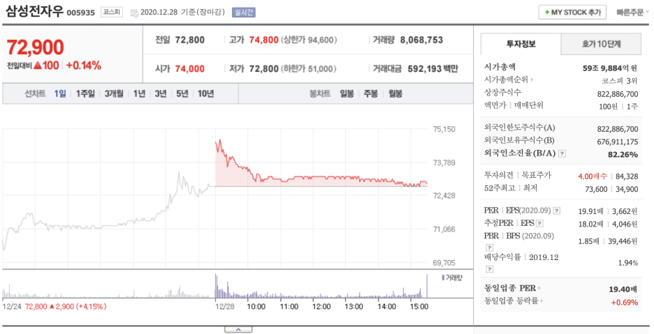 2020년 12월 28일 기준으로 삼성전자우는 1주당 72,900원이며