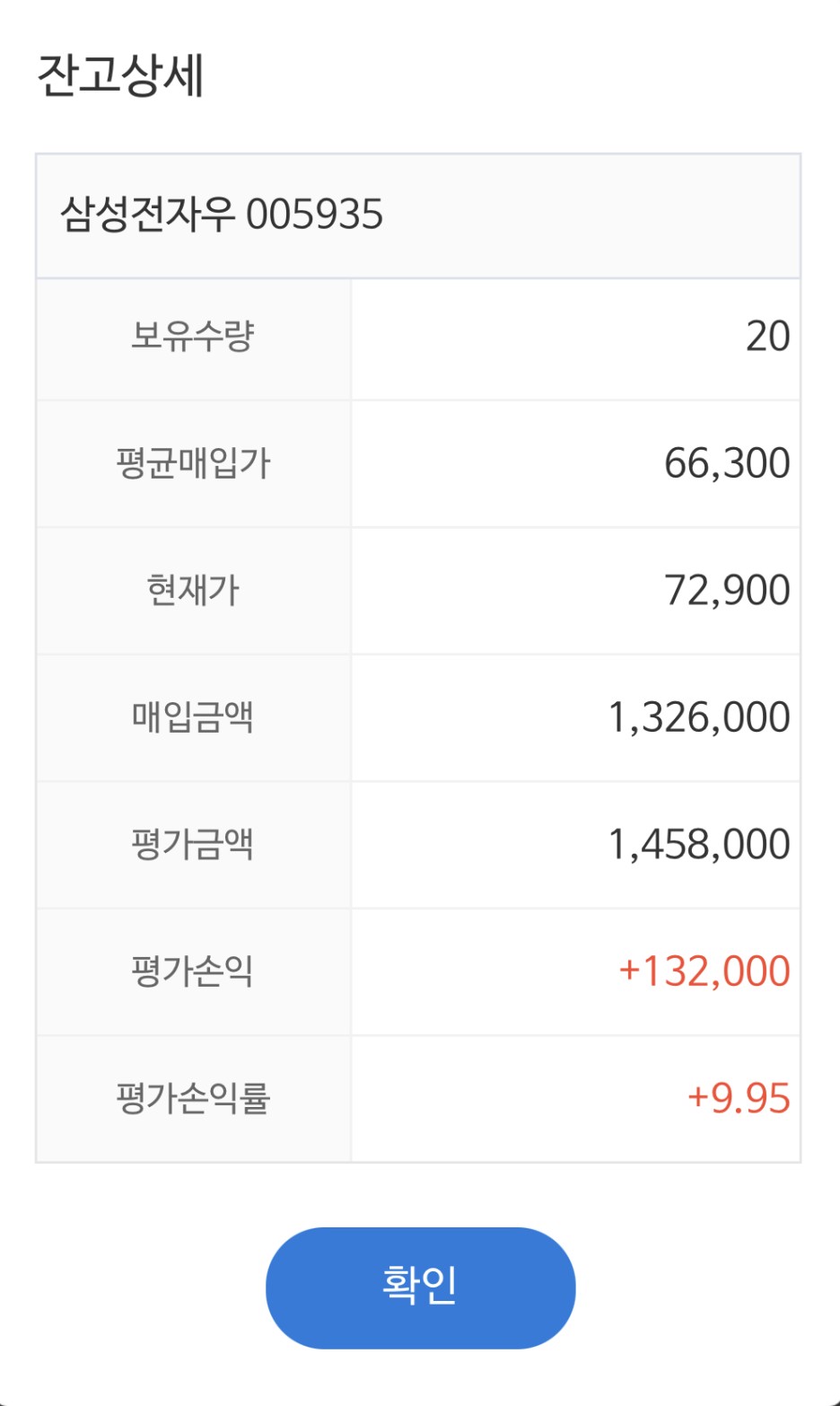 이번 10주 추가매수로 삼성전자우 주식을 총 20주를 보유하게 되었으며