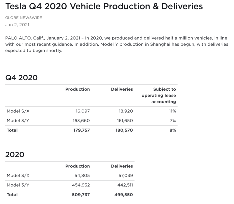 PALO ALTO, Calif., January 2, 2021 – In 2020, we produced and delivered half a million vehicles, in line with our most recent guidance. In addition, Model Y production in Shanghai has begun, with deliveries expected to begin shortly.