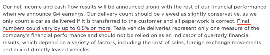 2020년 목표 전기차 판매수는 500,000대였는데 이번에 집계된 판매량은 499,550대임으로 달성 실패를 했다면 한것이겠지만, 해당 발표 밑 부분에 조망간 Q4 earning 리포트를 발표할 것이며 최종 판매대수의 경우 0.5%정도 변동이 있을 수 있다고 합니다.