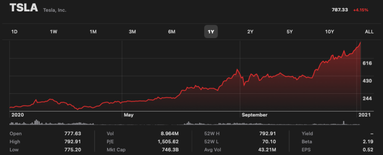 10루타를 친 종목은 당연히? 저세상 주식이라 불리는 테슬라이며 2019년 11월18일에 주당 $354.13(액면분할 후 주당 $70.83)을 30주를 매수하였고, 2020년 2월 7일에 원금회수 목적으로 주당 $875.00에 10주(액면분할 후 50주)를 매도한 후 나머지 20주(액면분할 후 100주)를 현재까지 들고 있습니다.