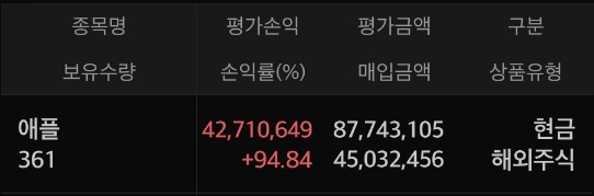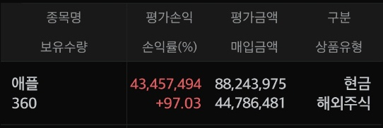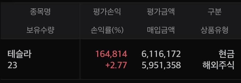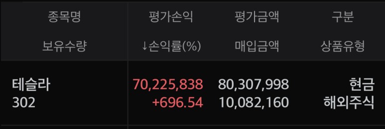 저는 테슬라를 325주를 보유하고 있으며, 투자 수익률은 각각 696.54%(1계좌) 그리고 2.77%(2계좌)입니다~!