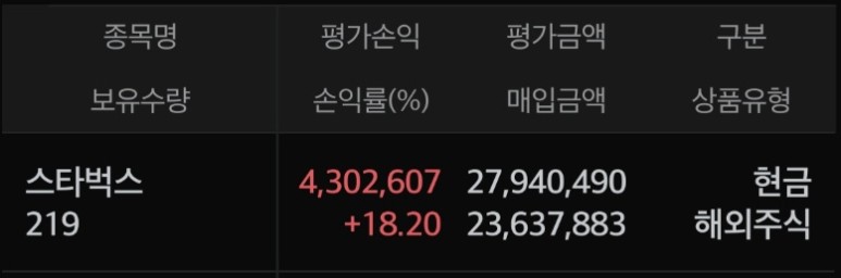 | [visionTECH] 스타벅스 219주 배당금 수령 후기 (2024/02/23) (0) | 2024.02.23 |