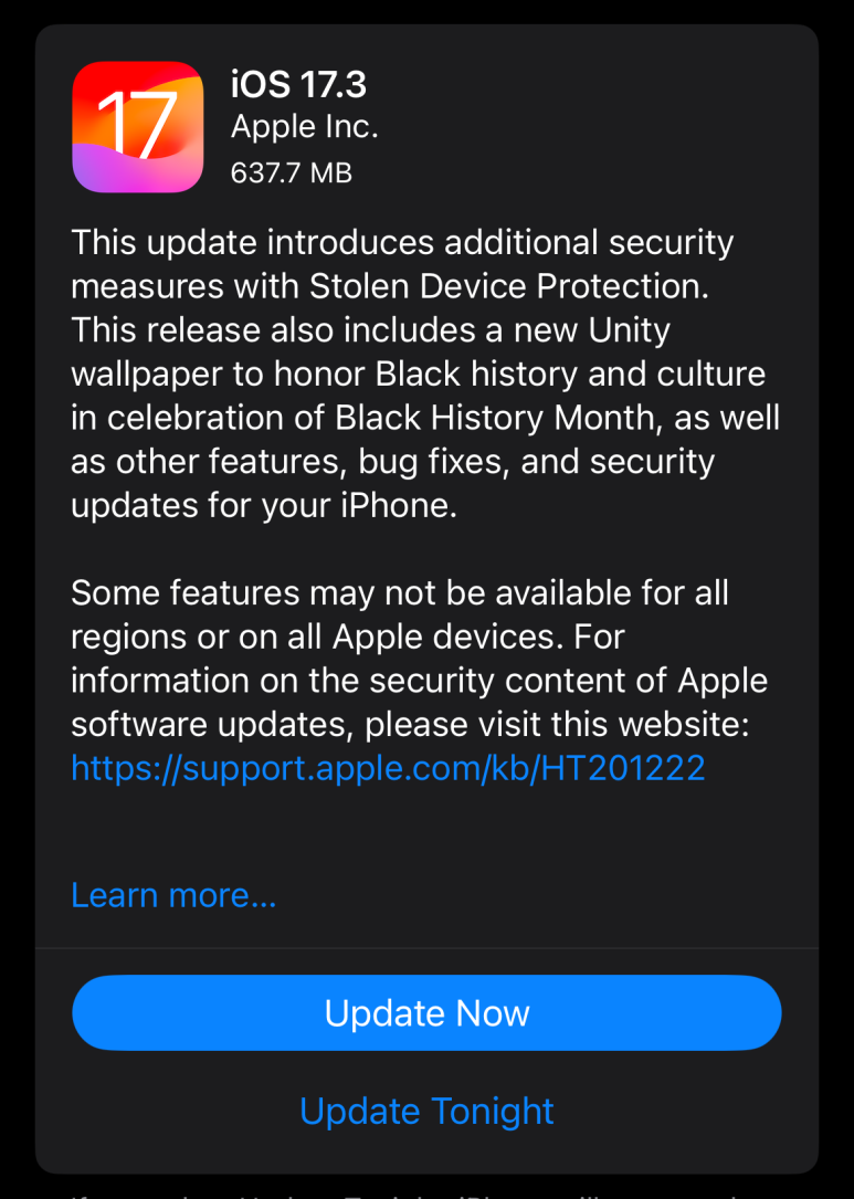 이번 업데이트는 iOS17.3의 소수점 업데이트이며, 주로 버그수정이 적용된 버전임으로 업데이트를 하시는 것을 추천드립니다~^^