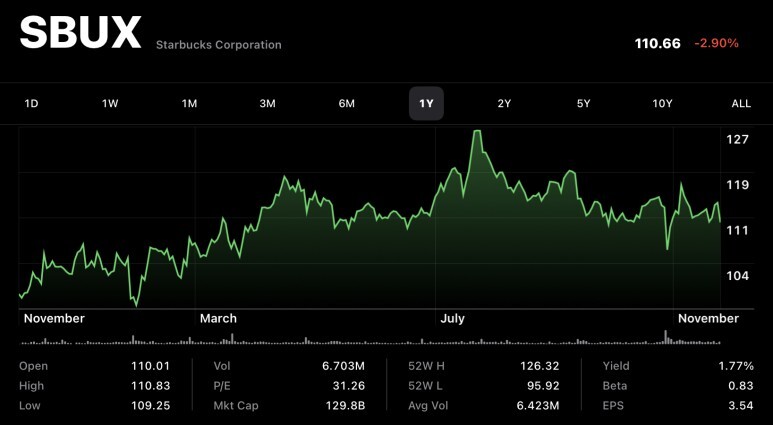 2021년 11월 29일 기준으로 스타벅스 주가는 주당 $110.66이며, 배당금은 1.77%로 배당금이 많은편은 아니지만 매년 배당금을 지속적으로 올려주고 있고
