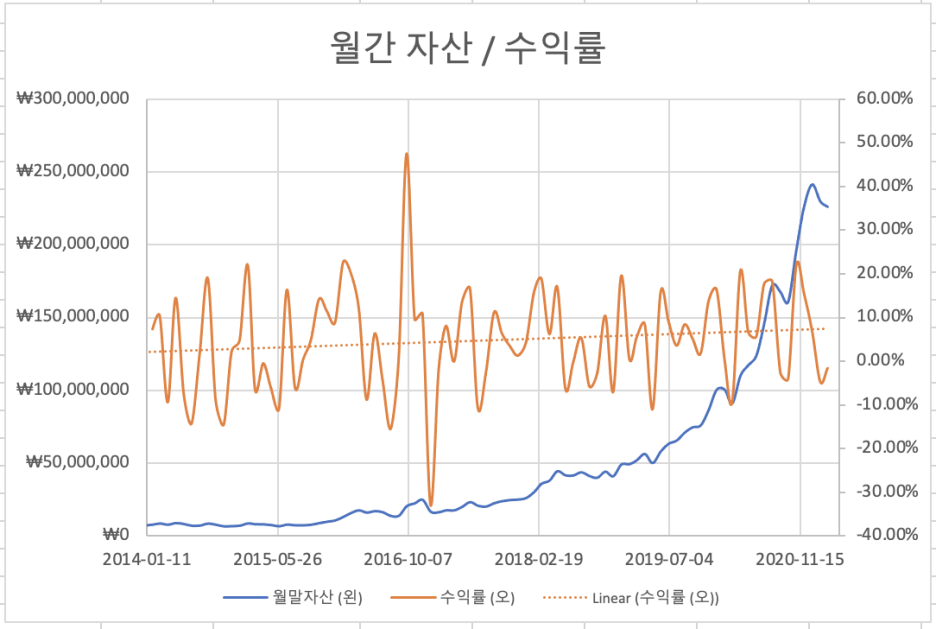 제 포트폴리오에 테크 주식의 비중이 커서 2021년 1월을 기점으로 자산가치가 하락하고 있습니다.