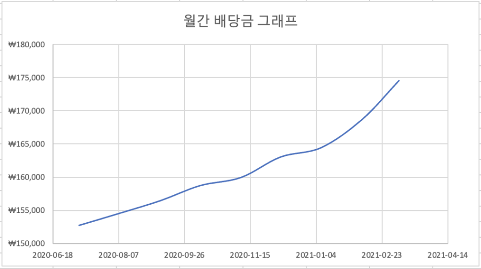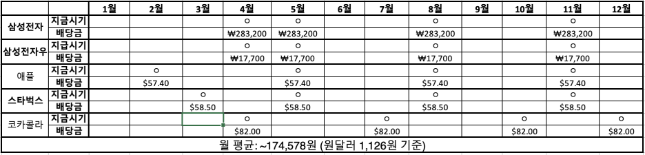 이번 스타벅스 매수로 월 평균 배당금은 174,578원이 되었으며 적지만 매달 배당금 수령액이 증가하고 있습니다.