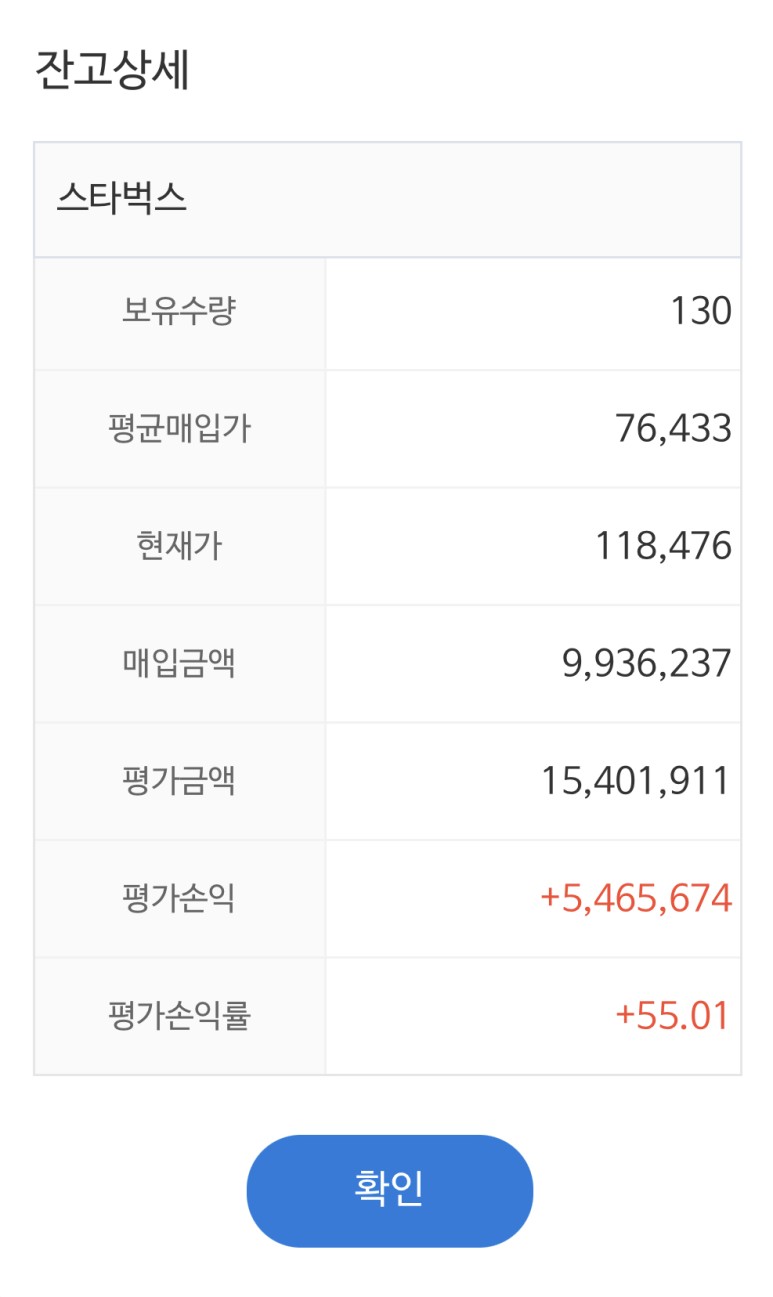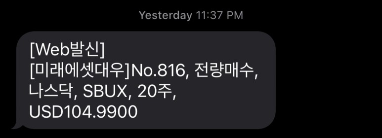 | 스타벅스 20주 추가매수 (2021/3/5, 총 주식수 130주) (0) | 2021.03.06 |