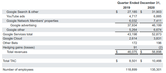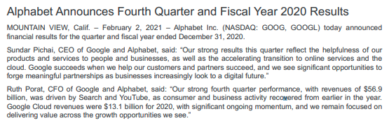한 가지 흥이로운 부분은 이번에 처음으로 알파벳이 Google Cloud 부분의 매출을 공개했다는 것인데 2019년 대비 2020년에 매출이 늘었다고 하더라도 연간기준 적자인데, 그럼에도 불구하고 공개를 했다는 것은 차후 매출증가&순이익 달성에 자신감이 있다는 느낌이 듭니다.