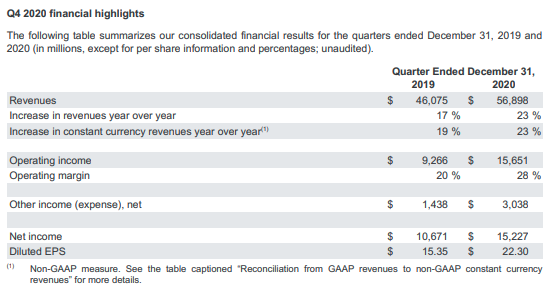 알파벳은 2020년 4분기에 매출 569억달러(한화 약 62조5900억원), 주당순이익(EPS) 22.3달러를 기록하였습니다. 1년 기준으로 보면 2019년에 비해 2020년의 매출은 약 23%, 영업이익은 약 70% 증가하였습니다.