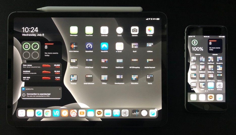 iPadOS 14 베타 2 홈 화면(왼), iOS 14 베타 2 홈 화면(오)