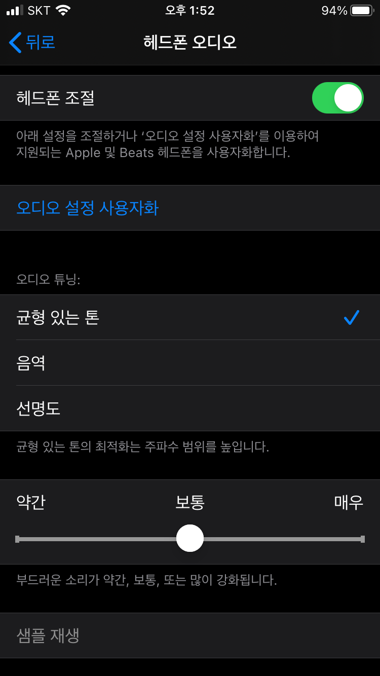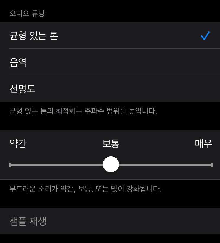 옵션들 중 보시면 "오디오 튜닝" 색션에 3가지 옵션(균형 있는 톤, 음역, 선명도)이 있고 각 옵션마다약간, 보통, 매우3단계로 음향을 변경할 수 있습니다~
