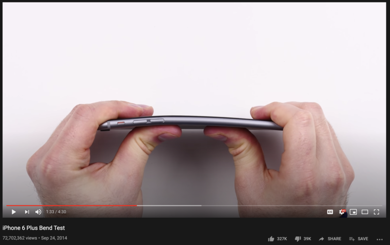 당시 맨손으로 너무나 쉽게 아이폰 6 플러스를 휘는 영상은 업로드 5일만에 5백만 조회수를 넘겼으며