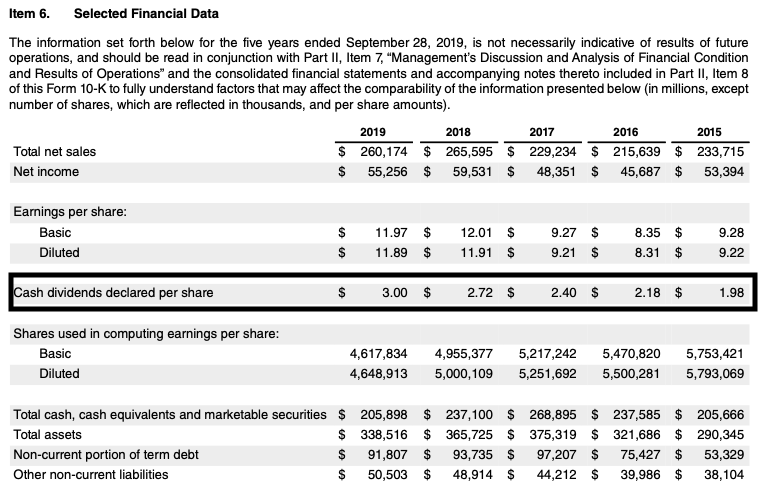 2019년 Apple Annual Report를 보시면 2015년 부터 배당금이 꾸준히~~ 증가하는 것을 보실 수 있는데요
