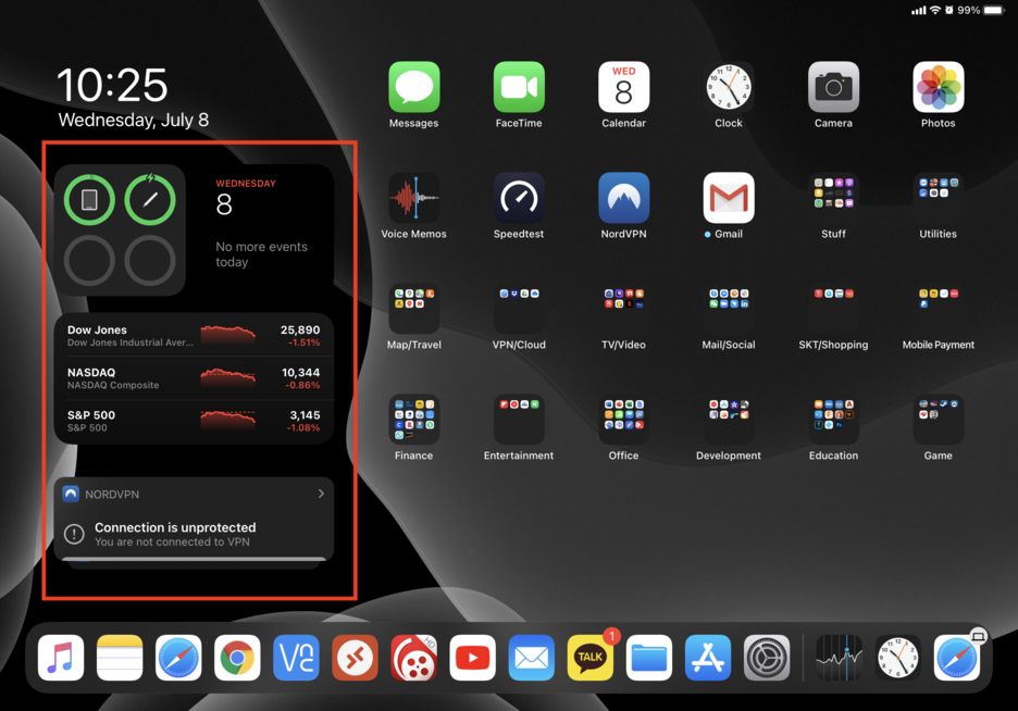 아이패드에서는 홈 화면에 위젯배치가 안되며 왼쪽부분에만 배치가 가능합니다...(밑에 빨간색으로 표기된 부분)