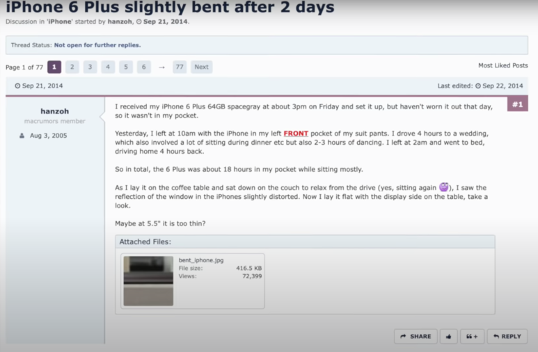 많은 사람들이 일상생활을 하는데 아이폰이 휜다는 이야기가 소셜미디아에 돌기 시작했으며 2014년 9우러22일 Macrumor에 hanzoh가 아이폰6 플러스를 "앞 주머니"에 넣고 일상생활을 했는데 휘었다면서 인증사진을 올렸습니다.