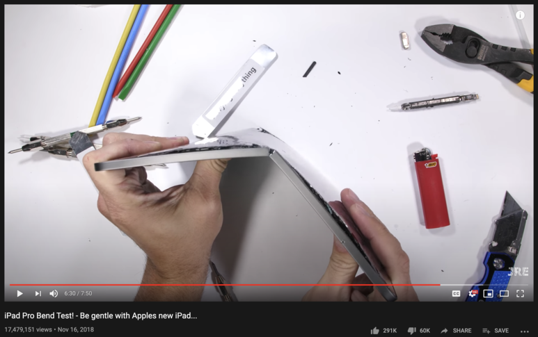 그...런...데... 유명 유튜버 중 한명인 JerryRigEverything에서 맨 손으로 아이패드를 가볍게? 휘는 영상이 업로드가 되었고 다시 한번 애플은 밴드게이트의 악몽에 빠지게 됩니다.