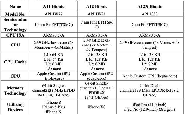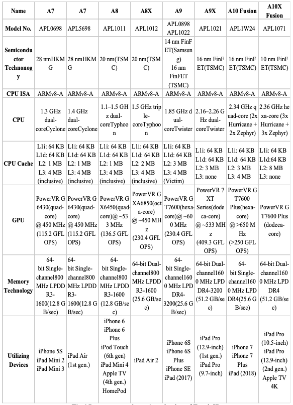 애플 A시리즈 상세 정보 (출처: Evolution of Apple's “A” Series Processors, http://www.ijera.com/papers/vol8no12/p2/K0812027177.pdf )