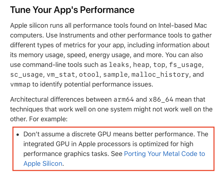 애플이 만든 내장그래픽(GPU)의 성능 언급 (출처: 애플: "Porting Your macOS Apps to Apple Silicon" 중, https://developer.apple.com/documentation/xcode/porting_your_macos_apps_to_apple_silicon)