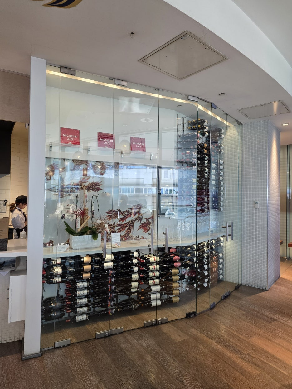 음식점을 들어가면 대기공간과 자리를 안내하는 직원들이 대기하고 있었고 와인들을 보관하는 공간에 2022~2024년 동안 받은 미쉐린 간판이 있었습니다.