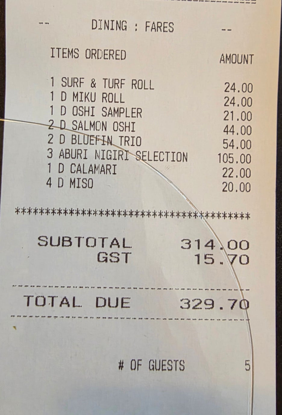 식사로 저희는 Miso Soup, Surf&Turf Roll, Miku Roll, Oshi Sampler, Salmon Oshi, Bluefin Trio, Aburi Nigiri selection, Calamari를 시켜서 먹었는데...